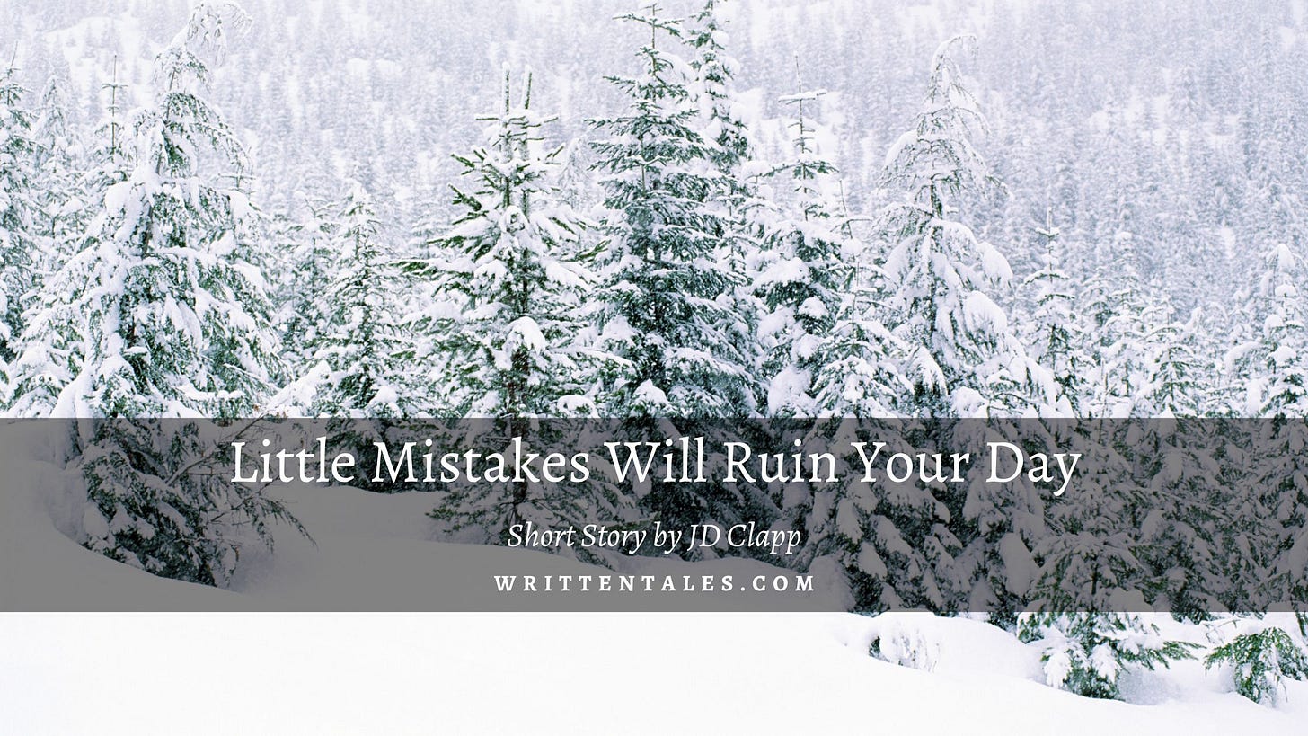 As he walked, the image of his mother scolding him when he did anything dangerous on family camping trips popped into his head. âLittle mistakes can ruin a nice day in the woods!â she would say.  He started laughing. Is busting my shoulder a little mistake or a big one, Ma?