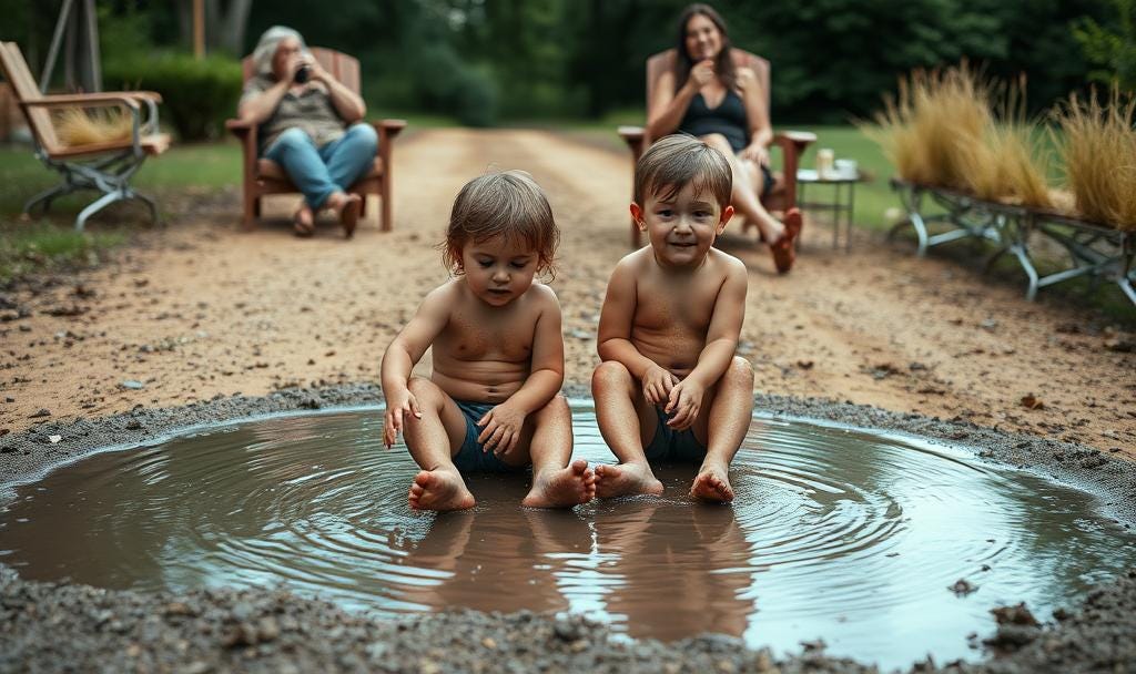 With relish, rainpour pools in our dead-end dirt road. We, David from across the street and me, sit in that puddle like it’s a lakeside resort. Our little buns caked in mud. Drawers soaked and drooping with glee. Our moms, lounging on aluminum chairs woven with green and blue stripes, pass the time smoking Viceroys and drinking black coffee.
