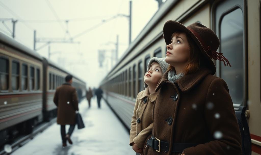 Near the platform door a child sits silent by her mother’s side; eyes following falling snowflakes. Her pale skin in pale light whispers waiting for the train to stop. She holds the child closer, both their faces upturned to the falling snow.